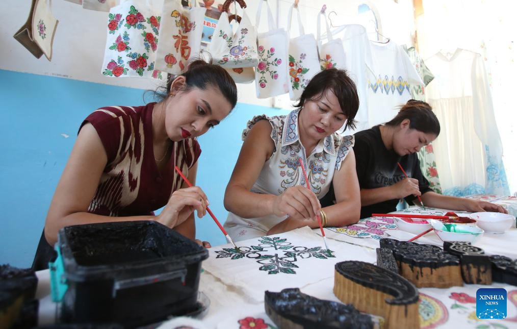 County-level inheritors of the wooden stamp printed fabric, a national-level intangible cultural heritage, work in a village in Yengisar County of Kashgar, northwest China's Xinjiang Uygur Autonomous Region, Sept. 11, 2025. The ancient city of Kashgar, located in southwestern Xinjiang, served as a vital transportation hub connecting China with Central Asia and South Asia in ancient times. The confluence of diverse ethnic cultures in this region has given rise to a wealth of historical and cultural treasures.
