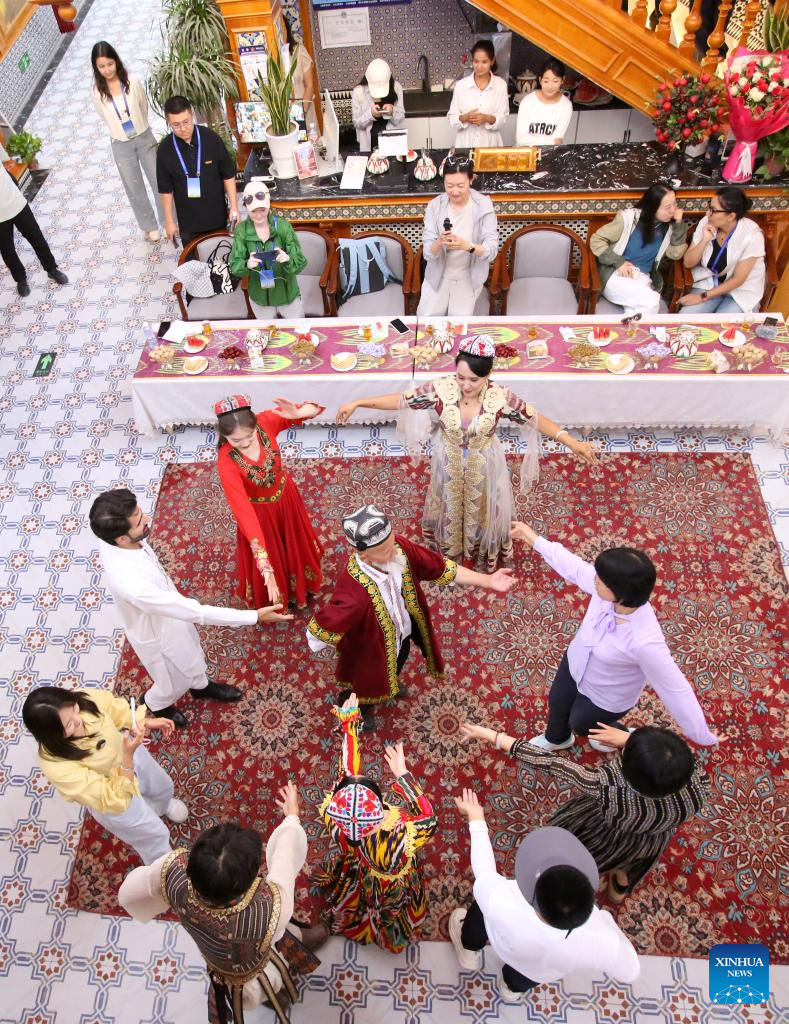 Tourists dance with staff members at a homestay, in the Kashgar Ancient City scenic spot, northwest China's Xinjiang Uygur Autonomous Region, Sept. 10, 2025. The ancient city of Kashgar, located in southwestern Xinjiang, served as a vital transportation hub connecting China with Central Asia and South Asia in ancient times. The confluence of diverse ethnic cultures in this region has given rise to a wealth of historical and cultural treasures.