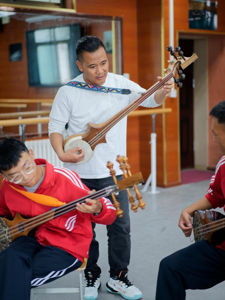 A teacher teaches students the playing skills of Zhanian, a traditional Tibetan stringed instrument, at a secondary vocational and technical school in Lhasa, southwest China's Xizang Autonomous Region, Sept. 9, 2025. (Xinhua/Zhang Xiaoyu)