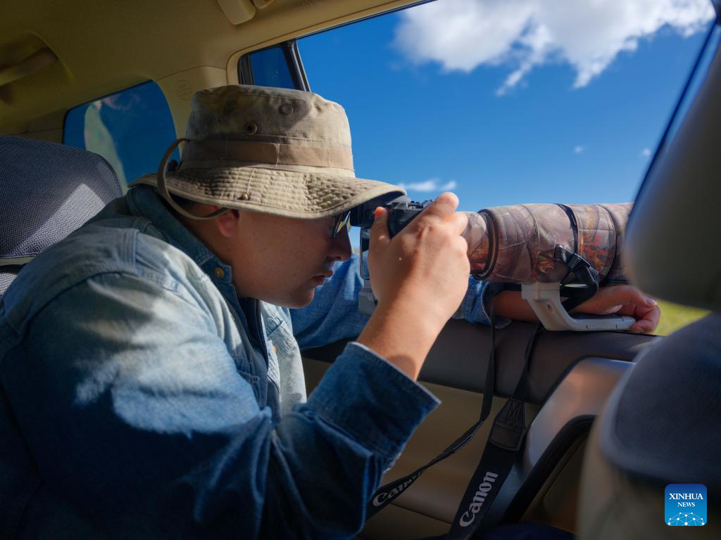 Bao Jincai takes photos of birds with a telephoto lens in the Ergune wetland in Hulun Buir, north China's Inner Mongolia Autonomous Region, Sept. 16, 2025. (Xinhua/Ma Jinrui)