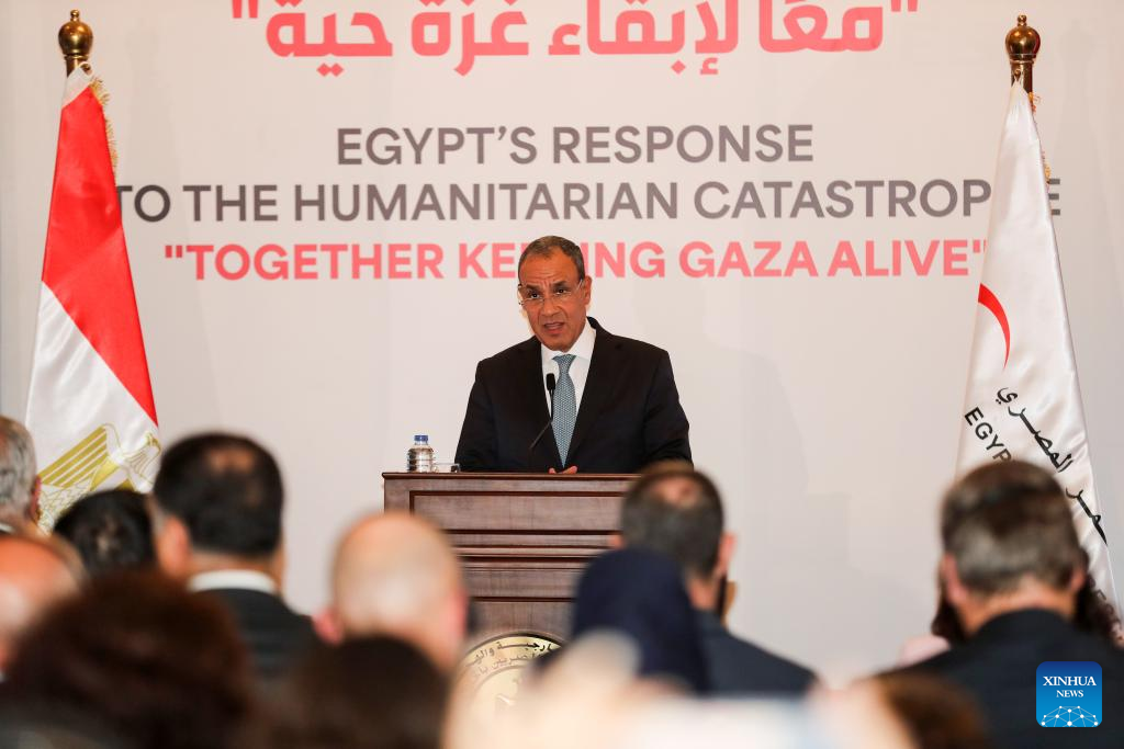 Egyptian Foreign Minister Badr Abdelatty speaks during an event to honor the Egyptian Red Crescent and its volunteers for their efforts in Gaza humanitarian aid in Cairo, Egypt, on Sept. 17, 2025. Egypt on Wednesday honored the Egyptian Red Crescent (ERC) and its volunteers for sustaining aid to Gaza, reaffirming its humanitarian and political support for the Palestinian people. (Xinhua/Sui Xiankai)