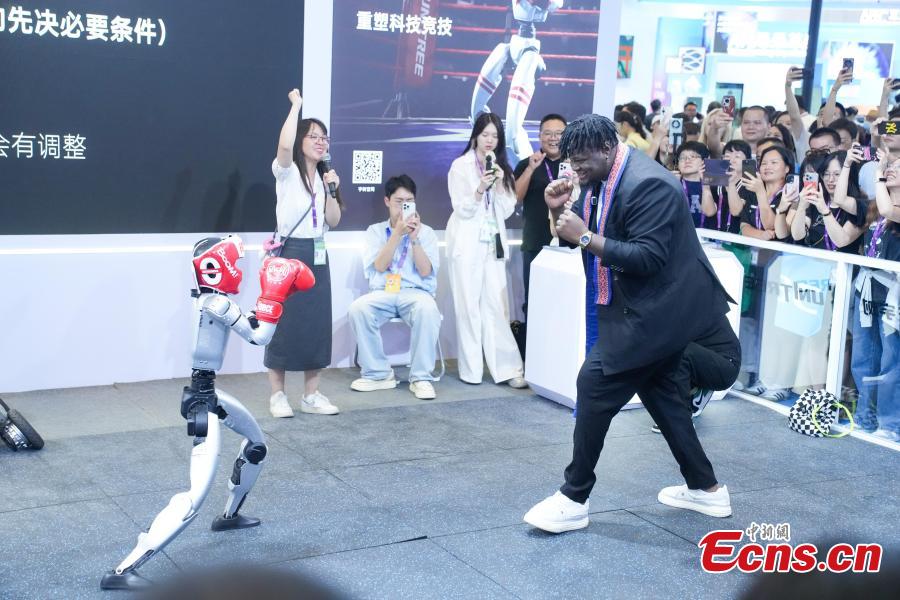 A Nigerian internet celebrity engages in a boxing match with a Unitree robot at the 22nd China-ASEAN Expo in Nanning, Guangxi Zhuang Autonomous Region, Sept. 17, 2025. (Photo: China News Service/Chen Guanyan)