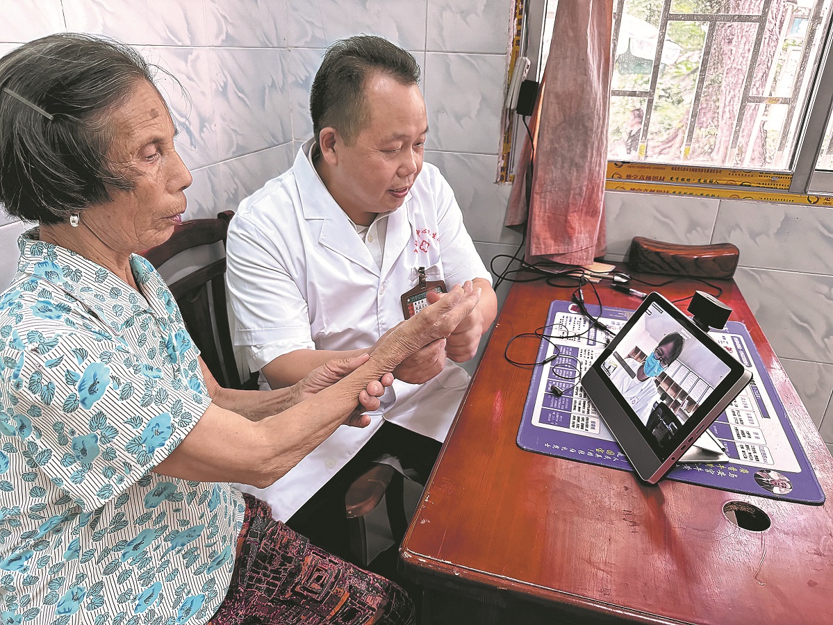A doctor diagnoses a patient at a village clinic in Lingchuan county, Guangxi Zhuang autonomous region, with help from a medical expert via video link. HUANG KAIYING/XINHUA