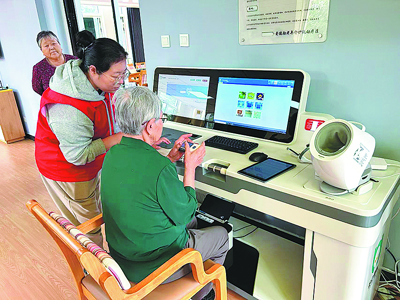 A health worker helps an elderly woman use artificial intelligence-based medical examination equipment in Tianjin's Dongli district in October. YIN SIYUAN/XINHUA