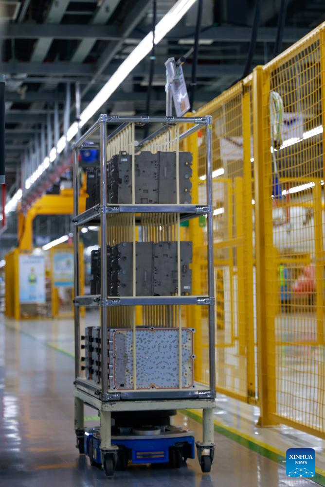 An automated guided vehicle (AGV) delivers supplies at a workshop of Jabil Circuit (Wuxi) Co., Ltd. at Wuxi Hi-Tech District Comprehensive Bonded Zone in Wuxi, east China's Jiangsu Province, on Sept. 15, 2025. (Xinhua/Liu Jiaqi)