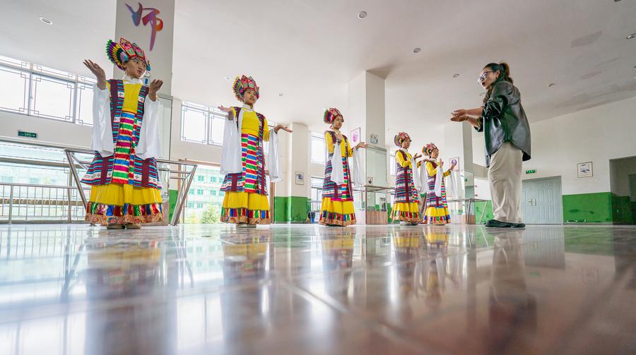 Students practice Tibetan opera at Lhasa Experimental Primary School in Lhasa, southwest China's Xizang Autonomous Region, Sept. 11, 2025. (Xinhua/Jigme Dorje)