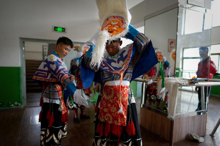 Students put on Tibetan opera costumes at Lhasa No. 2 secondary vocational and technical school in Lhasa, southwest China's Xizang Autonomous Region, Sept. 9, 2025. (Xinhua/Jigme Dorje)