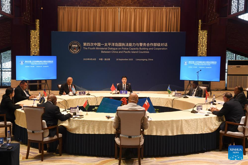 Chinese State Councilor and Minister of Public Security Wang Xiaohong and Tonga's Minister for Police Paula Piukala co-chair the fourth ministerial dialogue on police capacity building and cooperation between China and the Pacific Island countries in Lianyungang, east China's Jiangsu Province, Sept. 18, 2025. (Photo by Liu Zhenrui/Xinhua)