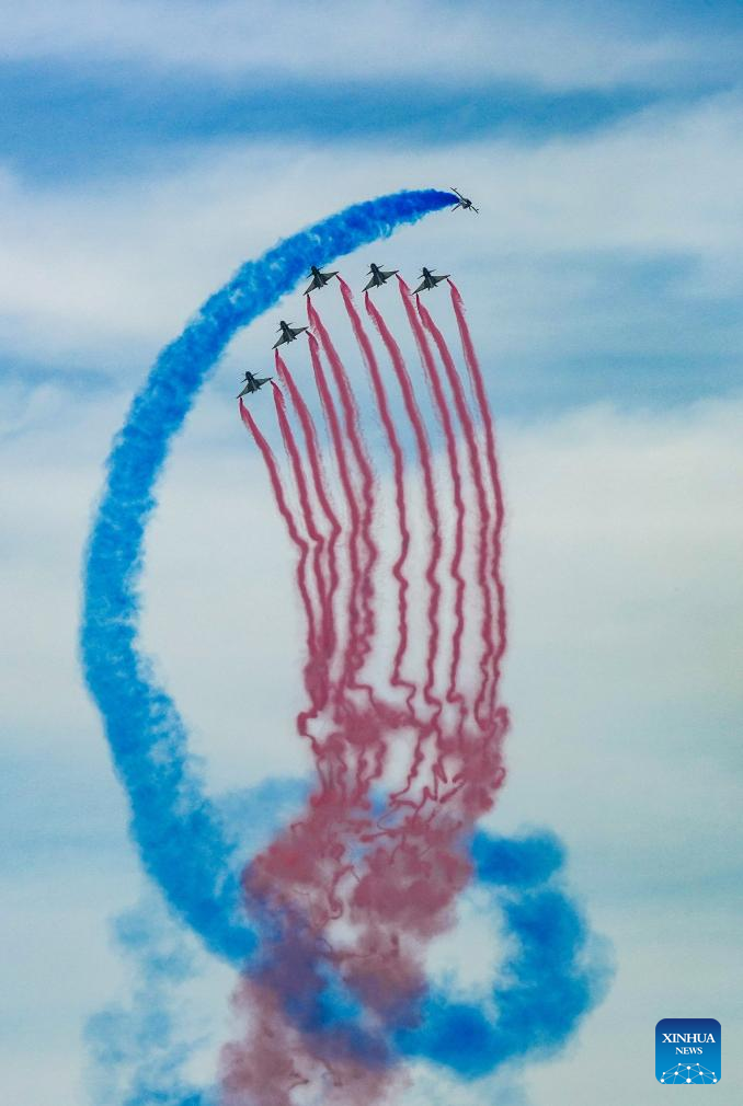 Aircraft of the Bayi Aerobatic Team of the Chinese People's Liberation Army Air Force perform during the 2025 aviation open-day activities of the Chinese People's Liberation Army Air Force and Changchun Air Show in Changchun, northeast China's Jilin Province, Sept. 19, 2025. The events kicked off here on Friday. (Xinhua/Yan Linyun)