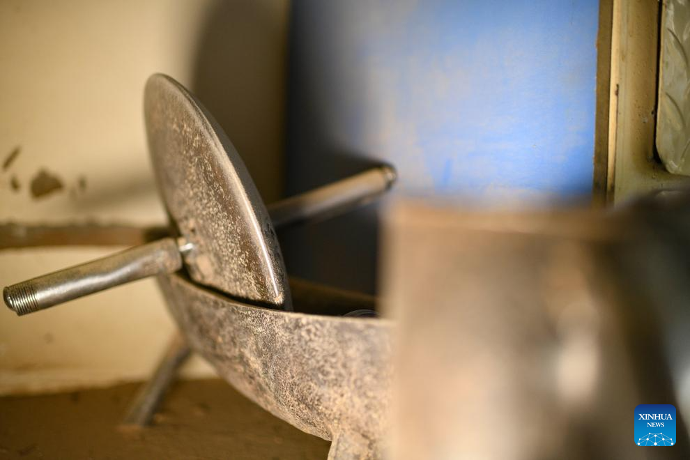 This photo taken on Sept. 5, 2025 shows the tool for grinding herbal materials used by Metkasim Manglik at his herbal tea shop in Qira County, northwest China's Xinjiang Uygur Autonomous Region. (Xinhua/Hu Huhu)