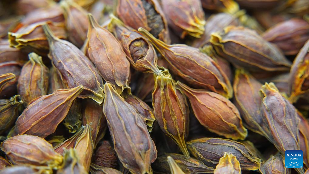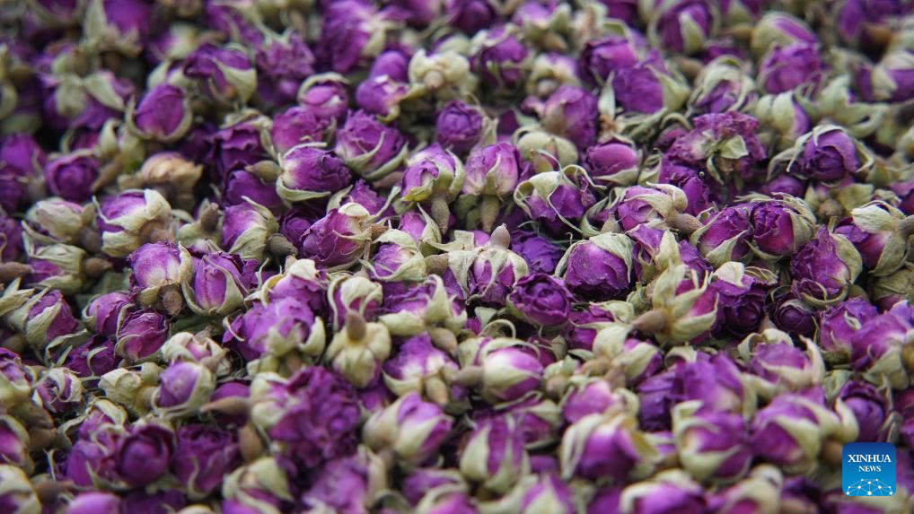 This photo taken on Sept. 18, 2025 shows herbal materials for herbal tea at Metkasim Manglik's herbal tea shop in Qira County, northwest China's Xinjiang Uygur Autonomous Region. (Photo by Miragul Memetreyim/Xinhua)