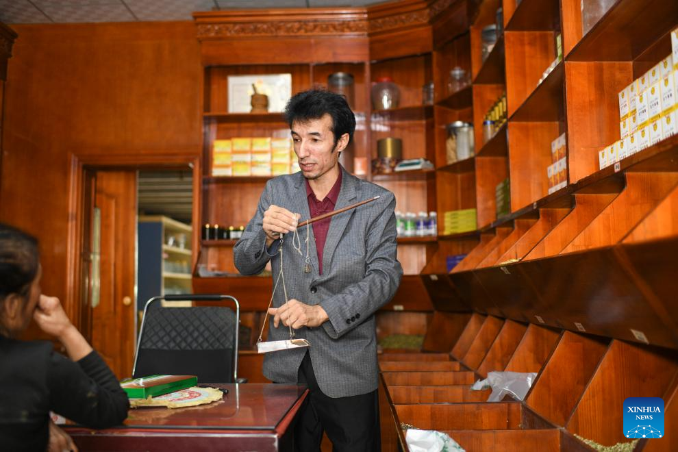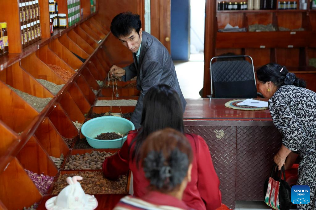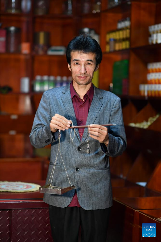 Metkasim Manglik receives customers at his herbal tea shop in Qira County, northwest China's Xinjiang Uygur Autonomous Region, Sept. 6, 2025. (Xinhua/Wang Fei)