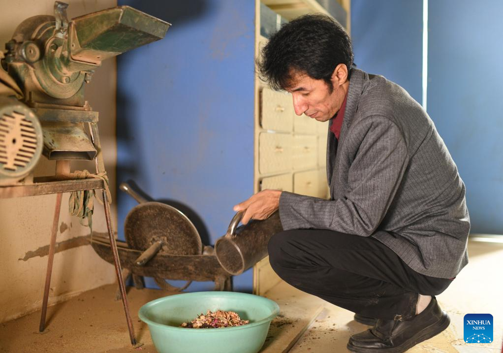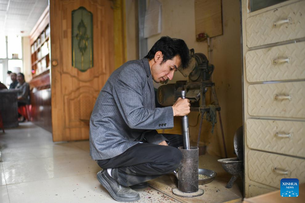 Metkasim Manglik grinds herbal materials at his herbal tea shop in Qira County, northwest China's Xinjiang Uygur Autonomous Region, Sept. 6, 2025. (Xinhua/Hu Huhu)