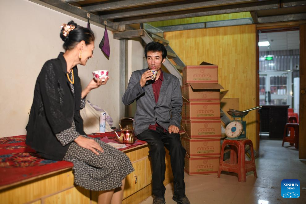 Metkasim Manglik (R) and his sister chat and drink herbal tea at his herbal tea shop in Qira County, northwest China's Xinjiang Uygur Autonomous Region, Sept. 6, 2025. (Xinhua/Hu Huhu)
