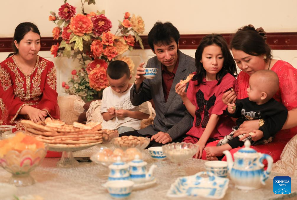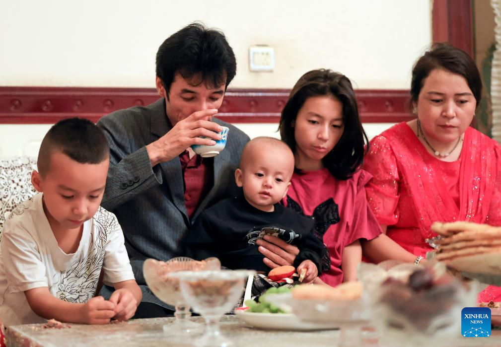Metkasim Manglik (2nd L) and his family have meal and drink herbal tea at home in Qira County, northwest China's Xinjiang Uygur Autonomous Region, Sept. 5, 2025. (Xinhua/Wang Fei)