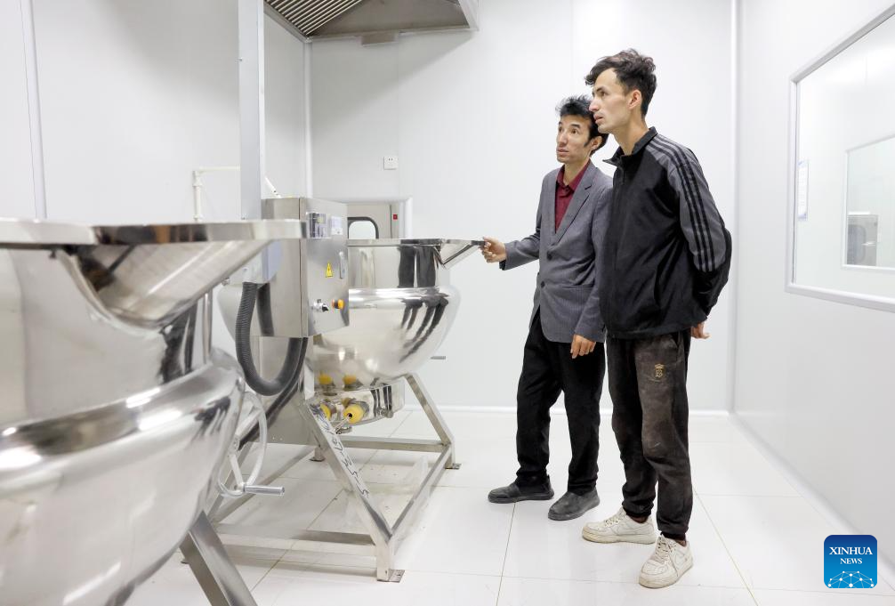 Metkasim Manglik (L) and his nephew check the equipment at a workshop of their factory which will soon be operational in Qira County, northwest China's Xinjiang Uygur Autonomous Region, Sept. 6, 2025. (Xinhua/Wang Fei)