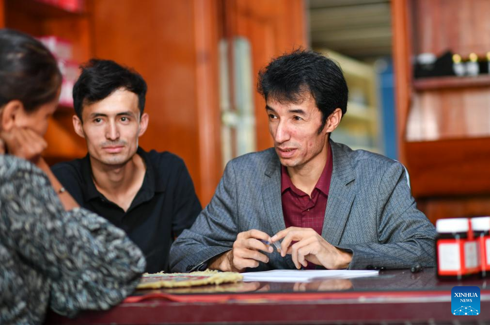 Metkasim Manglik (C) serves a customer at his herbal tea shop in Qira County, northwest China's Xinjiang Uygur Autonomous Region, Sept. 5, 2025. (Xinhua/Hu Huhu)