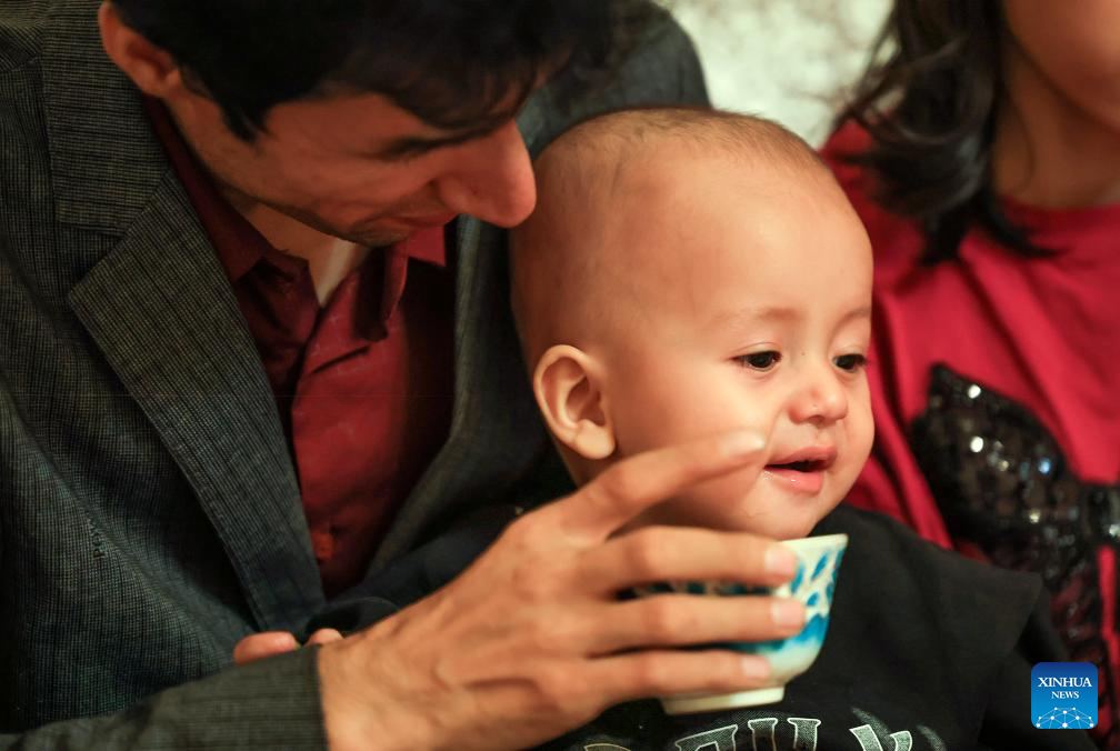 Metkasim Manglik feeds his son with herbal tea at home in Qira County, northwest China's Xinjiang Uygur Autonomous Region, Sept. 5, 2025. (Xinhua/Wang Fei)