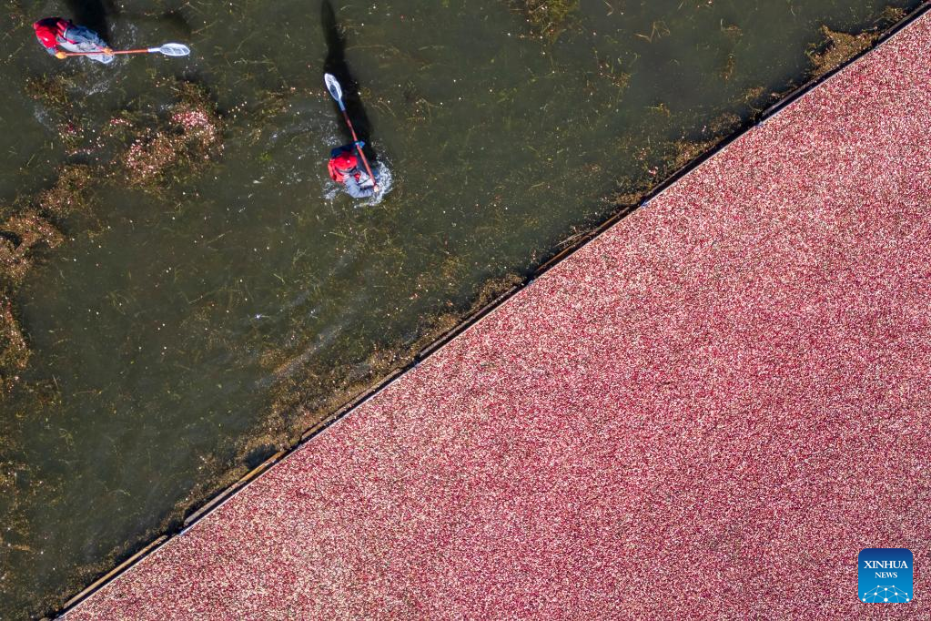 Workers harvest cranberries using flooding techniques at a cranberry planting base in Fuyuan, northeast China's Heilongjiang Province, on Sept. 21, 2025. A cranberry harvest festival was held on Sunday in Fuyuan, a leading hub for large-scale cranberry cultivation in China. (Xinhua/Zhang Tao)
