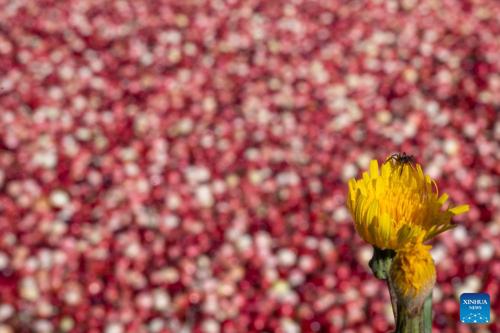 A flower is pictured at a cranberry planting base in Fuyuan, northeast China's Heilongjiang Province, on Sept. 21, 2025. A cranberry harvest festival was held on Sunday in Fuyuan, a leading hub for large-scale cranberry cultivation in China. (Xinhua/Zhang Tao)