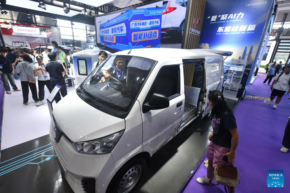 People view an electric vehicle produced in Liuzhou during the 22nd China-ASEAN Expo in Nanning, south China's Guangxi Zhuang Autonomous Region, Sept. 20, 2025. At the ongoing 22nd China-ASEAN Expo, new energy vehicles produced in Liuzhou of Guangxi and empowered by artificial intelligence draw wide attention from both domestic and overseas businesses and visitors. (Xinhua/Zhou Tinglu)
