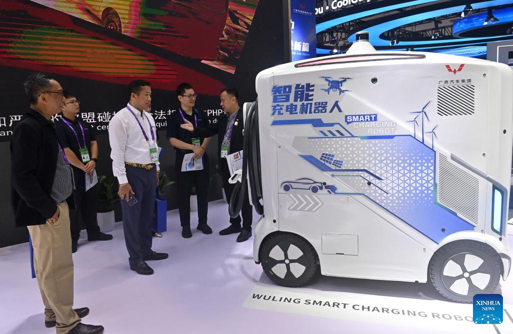 People view an intelligent charging robot during the 22nd China-ASEAN Expo in Nanning, south China's Guangxi Zhuang Autonomous Region, Sept. 19, 2025. At the ongoing 22nd China-ASEAN Expo, new energy vehicles produced in Liuzhou of Guangxi and empowered by artificial intelligence draw wide attention from both domestic and overseas businesses and visitors. (Xinhua/Lu Boan)