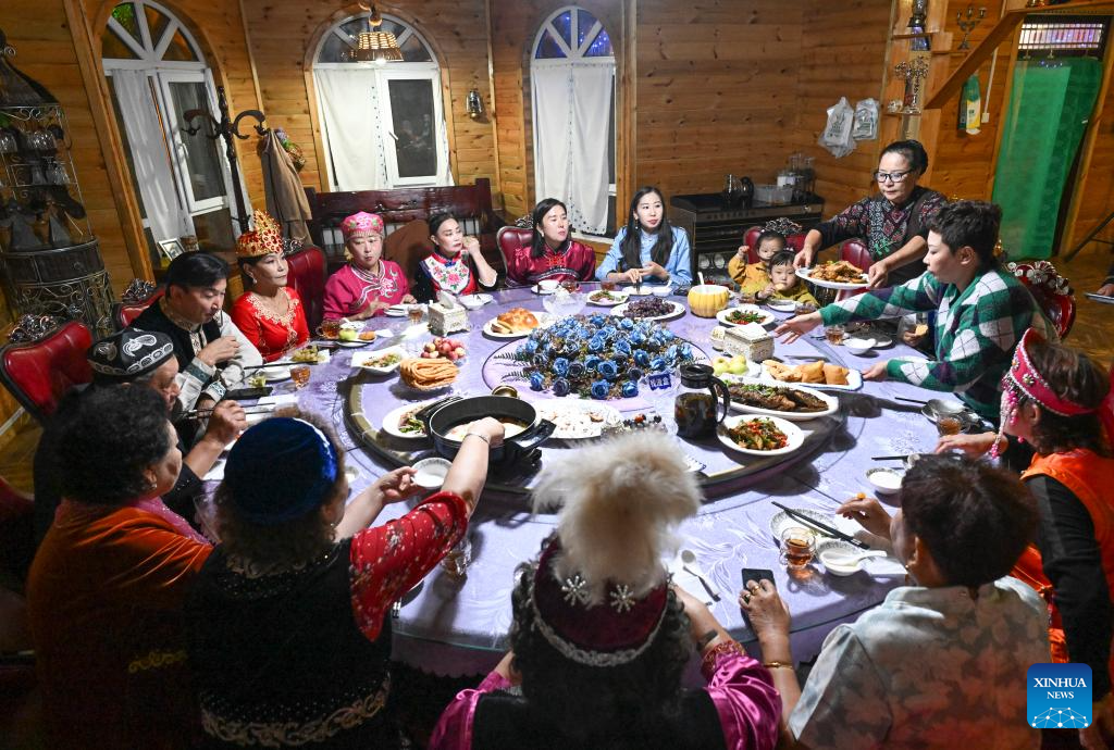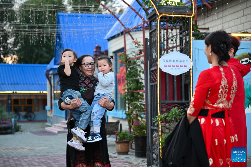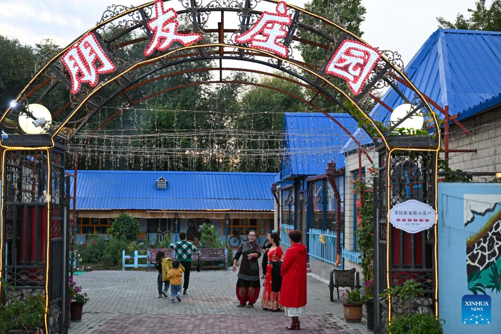 Guests from various ethnic groups are seen at the agritainment of Ma Xiuhua in Tacheng City, northwest China's Xinjiang Uygur Autonomous Region, Sept. 17, 2025.(Xinhua/Xin Yuewei)