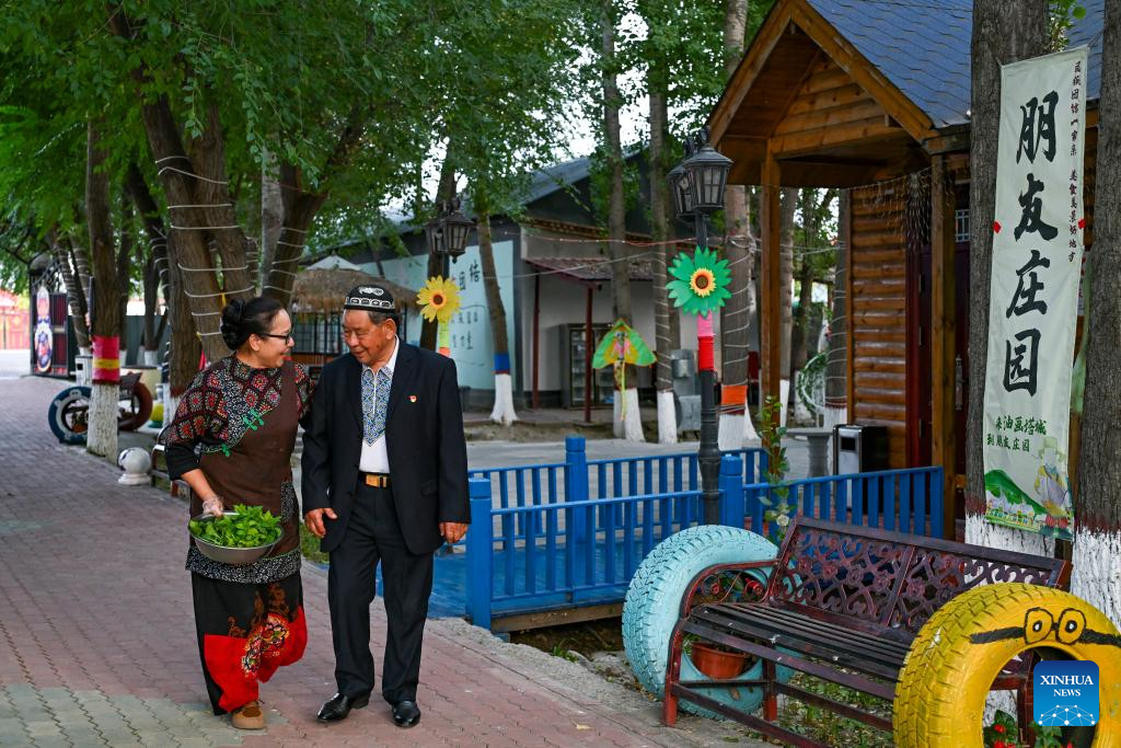 Ma Xiuhua (C) walks with her friends at her agritainment in Tacheng City, northwest China's Xinjiang Uygur Autonomous Region, Sept. 17, 2025.(Xinhua/Chen Shuo)