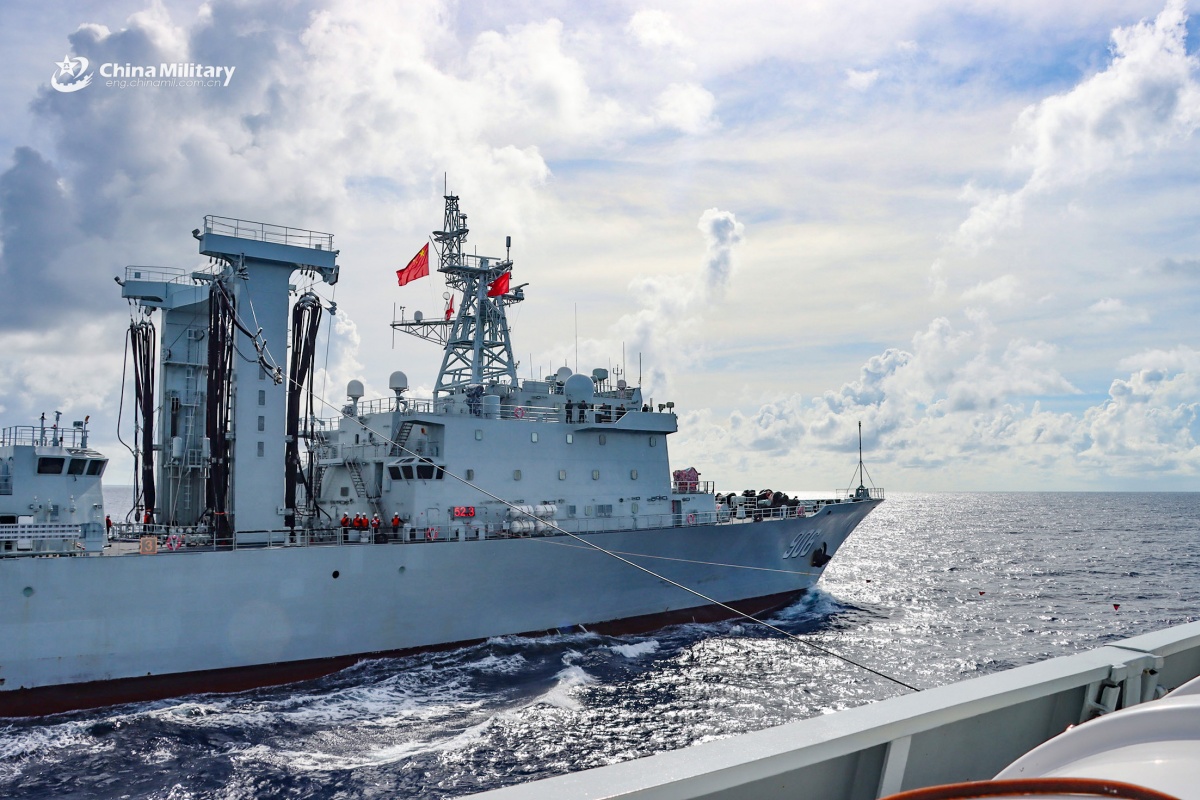 The guided-missile frigate Chenzhou (Hull 552) attached to a flotilla of the Chinese PLA Navy practices alongside replenishment-at-sea with the comprehensive supply ship Honghu (Hull 906) during a maritime training exercise in late August, 2025. (eng.chinamil.com.cn/Photo by Ge Hanqiang and Wang Chunguang)