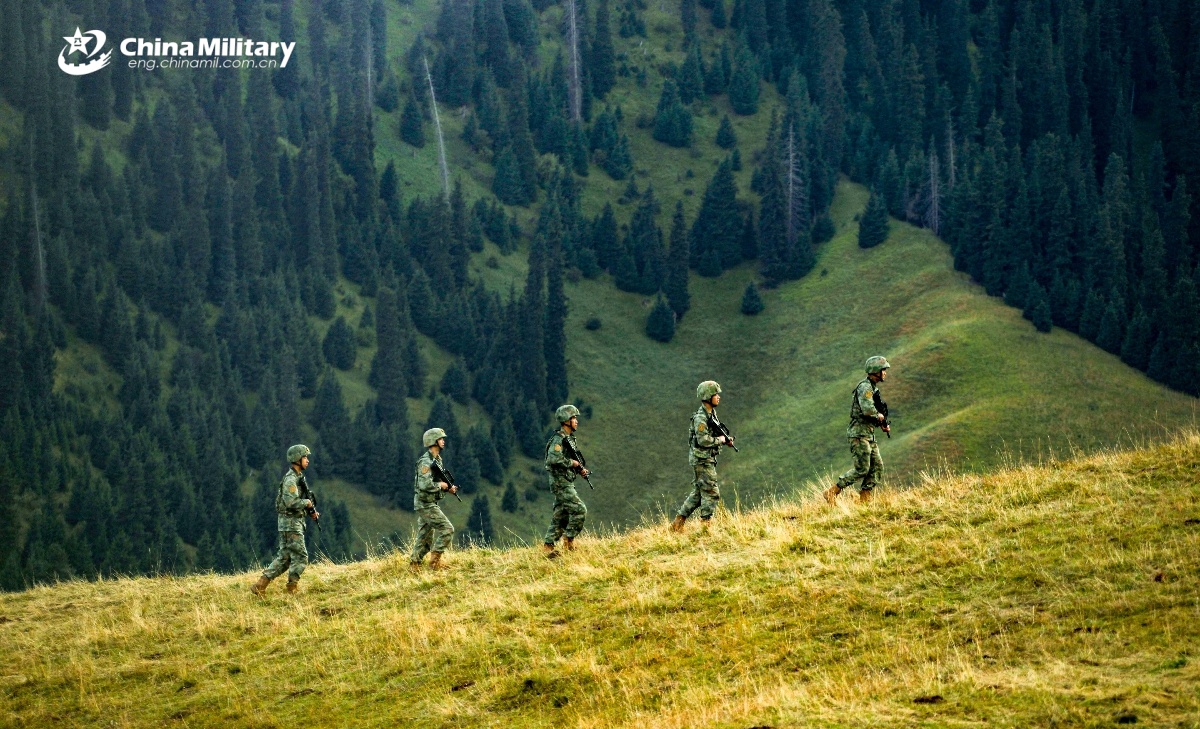 Soldiers assigned to a border defense company under the Chinese PLA Army walk along the mountain trail during a routine patrol mission in recent days. (eng.chinamil.com.cn/Photo by Zheng Yaqi)