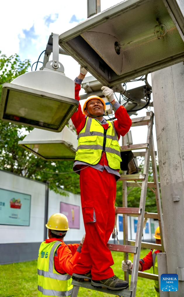 Staff members lower and reinforce the street lamps in Shenzhen, south China, Sept. 22, 2025. Shenzhen has activated emergency responses and taken various measures to battle Typhoon Ragasa. (Photo by Zhong Zijie/Xinhua)