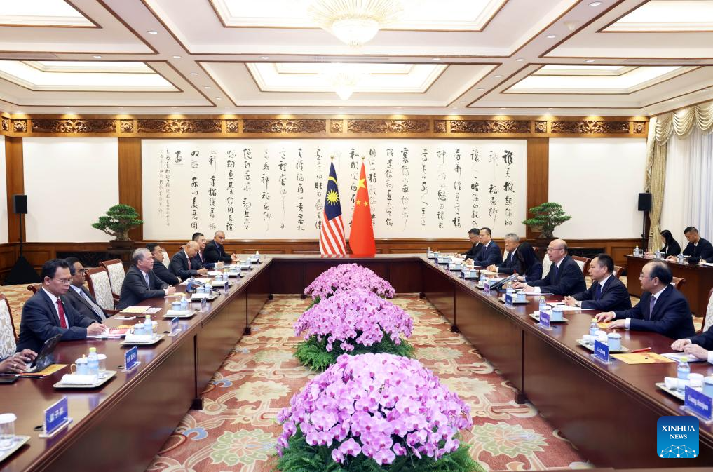Chinese Vice Premier Liu Guozhong, also a member of the Political Bureau of the Communist Party of China Central Committee, meets with Malaysia's Deputy Prime Minister and Minister of Energy Transition and Water Transformation Fadillah Yusof in Beijing, capital of China, Sept. 22, 2025. (Xinhua/Liu Weibing)