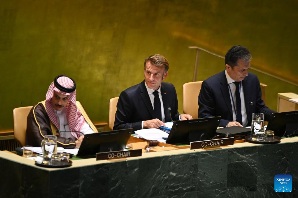 French President Emmanuel Macron (C) and Saudi Foreign Minister Faisal bin Farhan Al Saud (L) co-chair the High-Level International Conference for the Peaceful Settlement of the Question of Palestine and the Implementation of the Two-State Solution at the UN headquarters in New York, Sept. 22, 2025. (Xinhua/Li Rui)