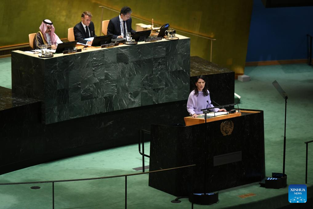 Annalena Baerbock (front), president of the 80th UN General Assembly session, speaks during the High-Level International Conference for the Peaceful Settlement of the Question of Palestine and the Implementation of the Two-State Solution at the UN headquarters in New York, Sept. 22, 2025. (Xinhua/Li Rui)