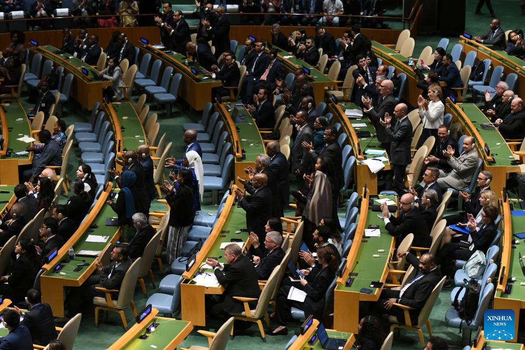 Members of Palestinian delegation applaud during the High-Level International Conference for the Peaceful Settlement of the Question of Palestine and the Implementation of the Two-State Solution at the UN headquarters in New York, Sept. 22, 2025. French President Emmanuel Macron said Monday at a UN meeting on the two-state solution that his country recognizes the State of Palestine, joining most of the other UN member states that have already done so. (Xinhua/Li Rui)