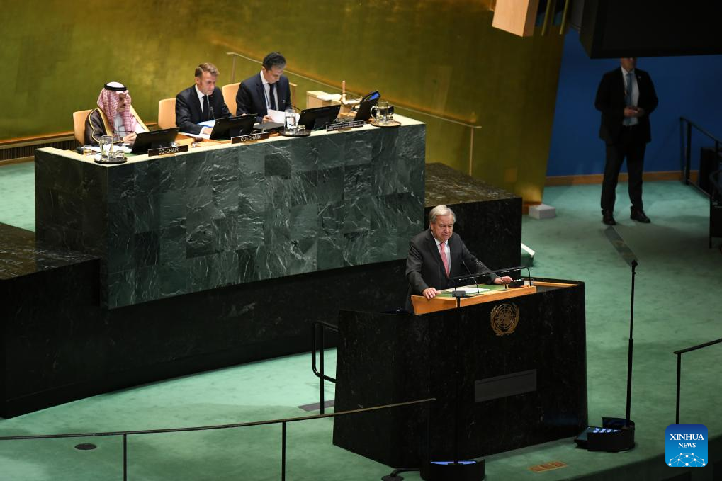 UN Secretary-General Antonio Guterres (front) speaks during the High-Level International Conference for the Peaceful Settlement of the Question of Palestine and the Implementation of the Two-State Solution at the UN headquarters in New York, Sept. 22, 2025. (Xinhua/Li Rui)