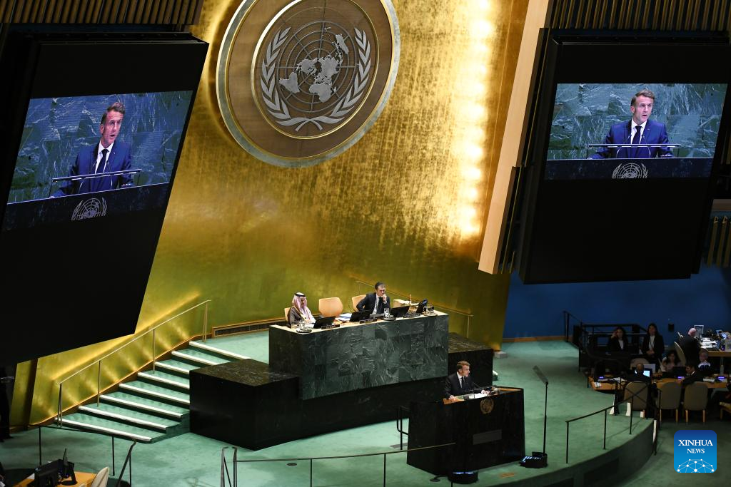 UNITED NATIONS, Sept. 22 (Xinhua) -- French President Emmanuel Macron said Monday at a UN meeting on the two-state solution that his country recognizes the State of Palestine, joining most of the other UN member states that have already done so.
