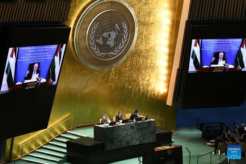 Palestinian President Mahmoud Abbas (on screens) speaks via video during the High-Level International Conference for the Peaceful Settlement of the Question of Palestine and the Implementation of the Two-State Solution held at the UN headquarters in New York, Sept. 22, 2025. (Xinhua/Li Rui)