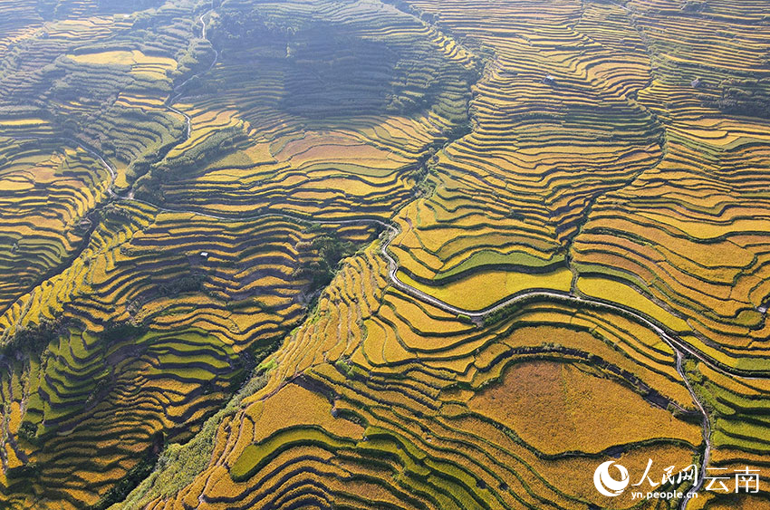 The Shier Longquan terraced fields in Honghe county, Honghe Hani and Yi Autonomous Prefecture, southwest China's Yunnan Province, burst with golden hues. (People's Daily Online/Li Ze'nyu)
