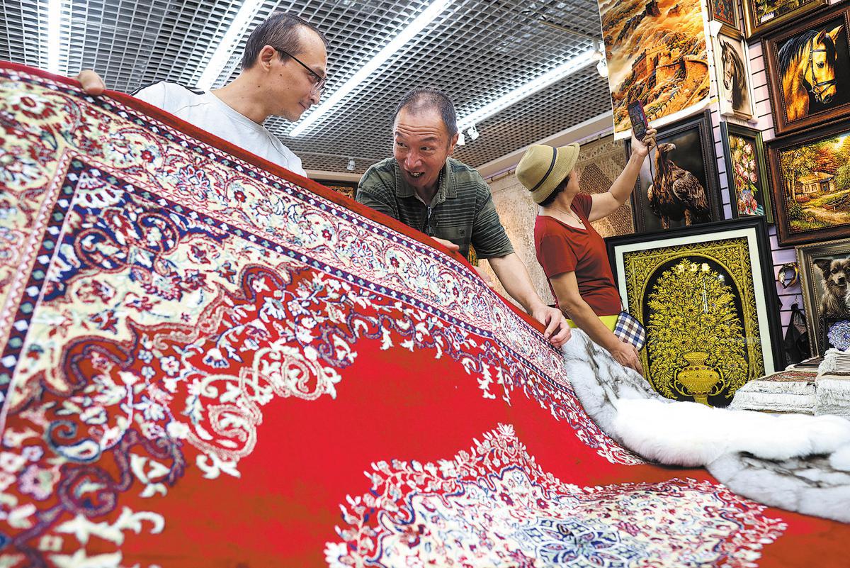 Tourists shop for carpets at a store at the Grand Bazaar Pedestrian Mall in Urumqi, on Sept 8. ZHU XINGXIN/CHINA DAILY