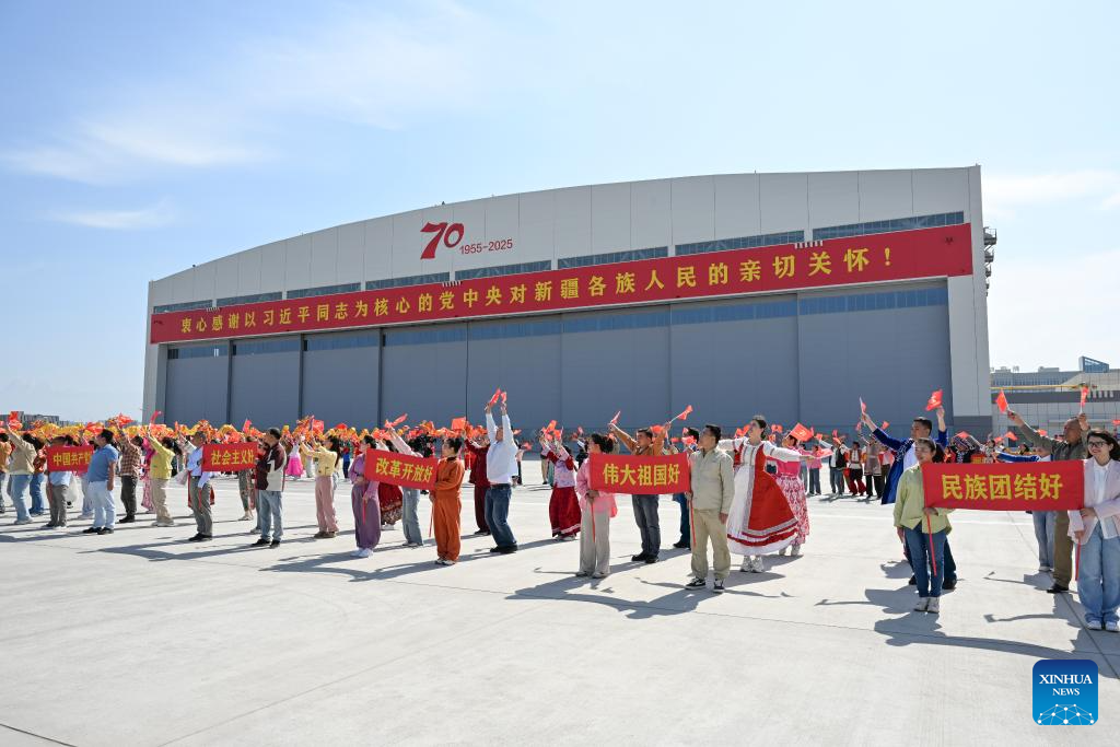 Chinese President Xi Jinping, also general secretary of the Communist Party of China Central Committee and chairman of the Central Military Commission, and the delegation receive a warm welcome from people of various ethnic groups at the Urumqi Tianshan International Airport and in Urumqi's city proper, northwest China's Xinjiang Uygur Autonomous Region, Sept. 23, 2025. Xi, who leads a central delegation, arrived in Urumqi, capital of Xinjiang Uygur Autonomous Region, on Tuesday to attend activities marking the region's 70th founding anniversary. (Xinhua/Zhang Ling)