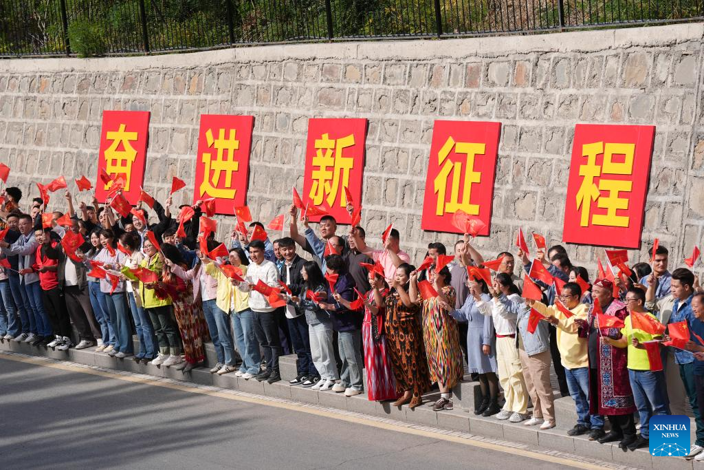 Chinese President Xi Jinping, also general secretary of the Communist Party of China Central Committee and chairman of the Central Military Commission, and the delegation receive a warm welcome from people of various ethnic groups at the Urumqi Tianshan International Airport and in Urumqi's city proper, northwest China's Xinjiang Uygur Autonomous Region, Sept. 23, 2025. Xi, who leads a central delegation, arrived in Urumqi, capital of Xinjiang Uygur Autonomous Region, on Tuesday to attend activities marking the region's 70th founding anniversary. (Xinhua/Ding Lin)