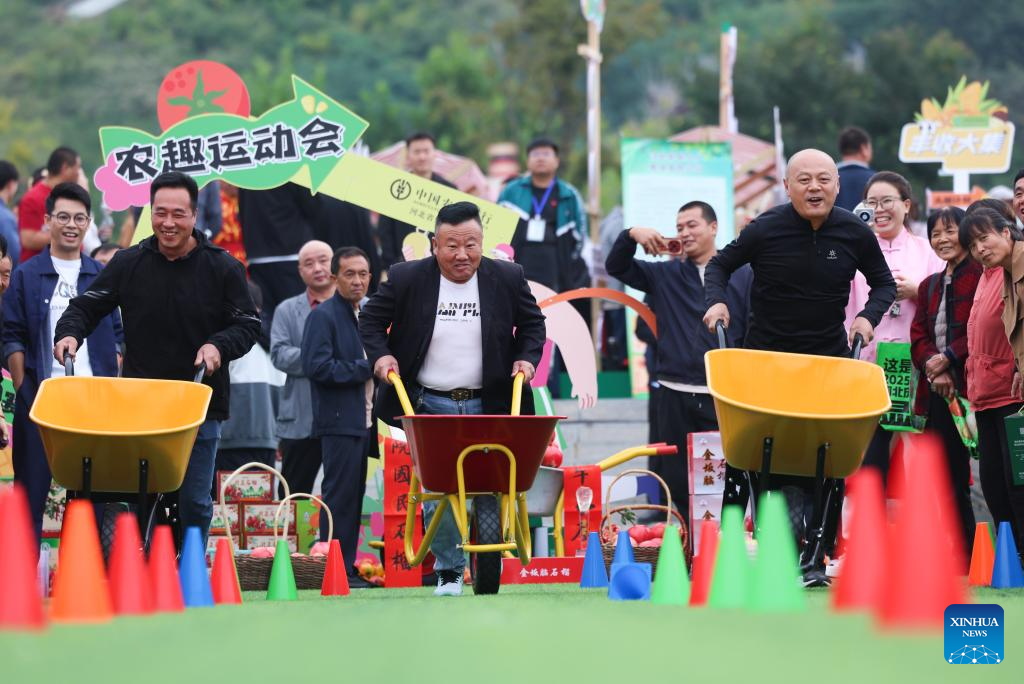 People participate in a farmers' fun sports event at the Chinese farmers' harvest festival celebrations in Yuanshi County, north China's Hebei Province, Sept. 23, 2025. The Chinese farmers' harvest festival is the first national festival created specifically for the country's farmers. Starting in 2018, the festival coincides with the Autumnal Equinox each year, which is one of the 24 solar terms of the Chinese lunisolar calendar and usually falls between Sept. 22 and 24 during the country's agricultural harvest season. (Photo by Liang Zidong/Xinhua)