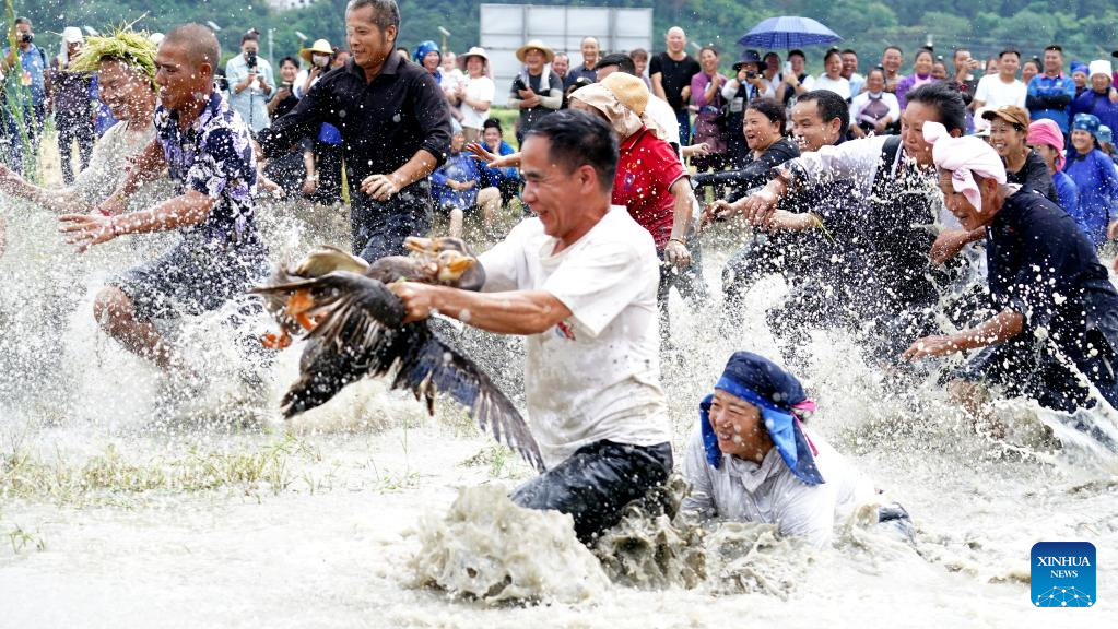 People participate in a duck-catching contest at the Chinese farmers' harvest festival celebrations in Rongjiang County, southwest China's Guizhou Province, Sept. 23, 2025. The Chinese farmers' harvest festival is the first national festival created specifically for the country's farmers. Starting in 2018, the festival coincides with the Autumnal Equinox each year, which is one of the 24 solar terms of the Chinese lunisolar calendar and usually falls between Sept. 22 and 24 during the country's agricultural harvest season. (Photo by Wang Bingzhen/Xinhua)