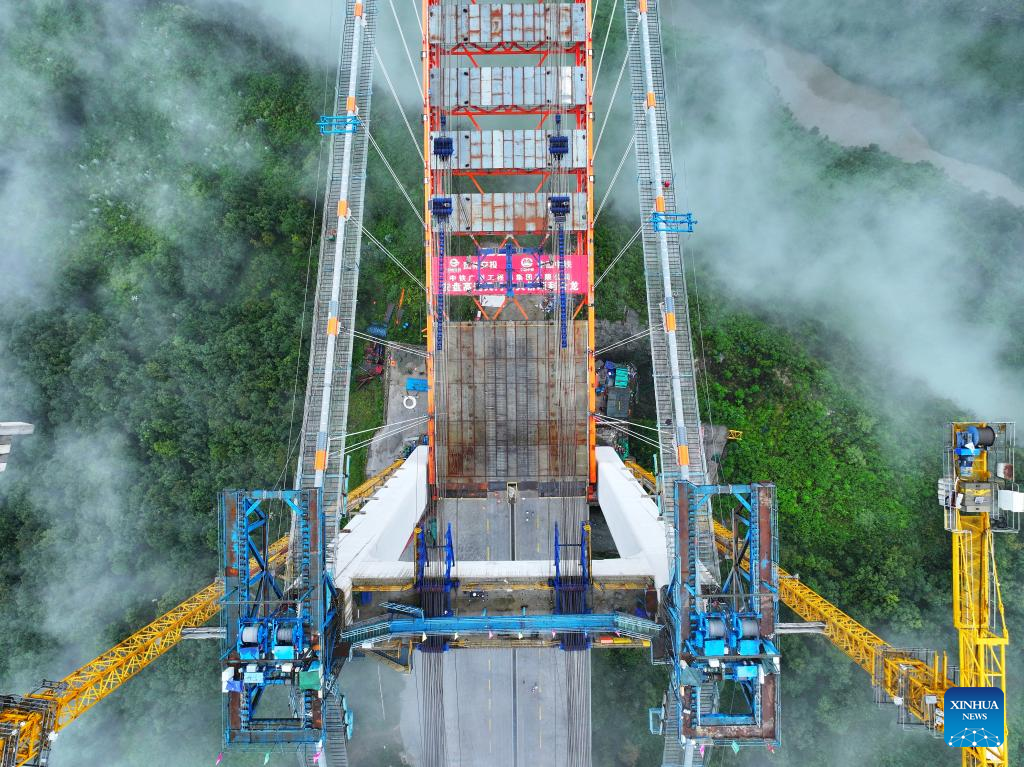An aerial drone photo taken on Sept. 23, 2025 shows the Tianmen grand bridge under construction in southwest China's Guizhou Province. The Tianmen grand bridge on the Anshun-Panzhou highway, with a length of 1,553 meters and the bridge floor hung about 560 meters above the canyon water, finished its closure on Tuesday. (Xinhua/Liu Xu)