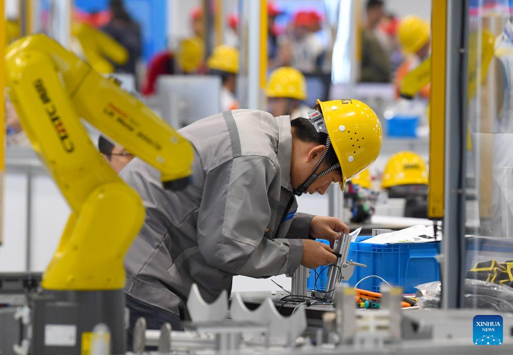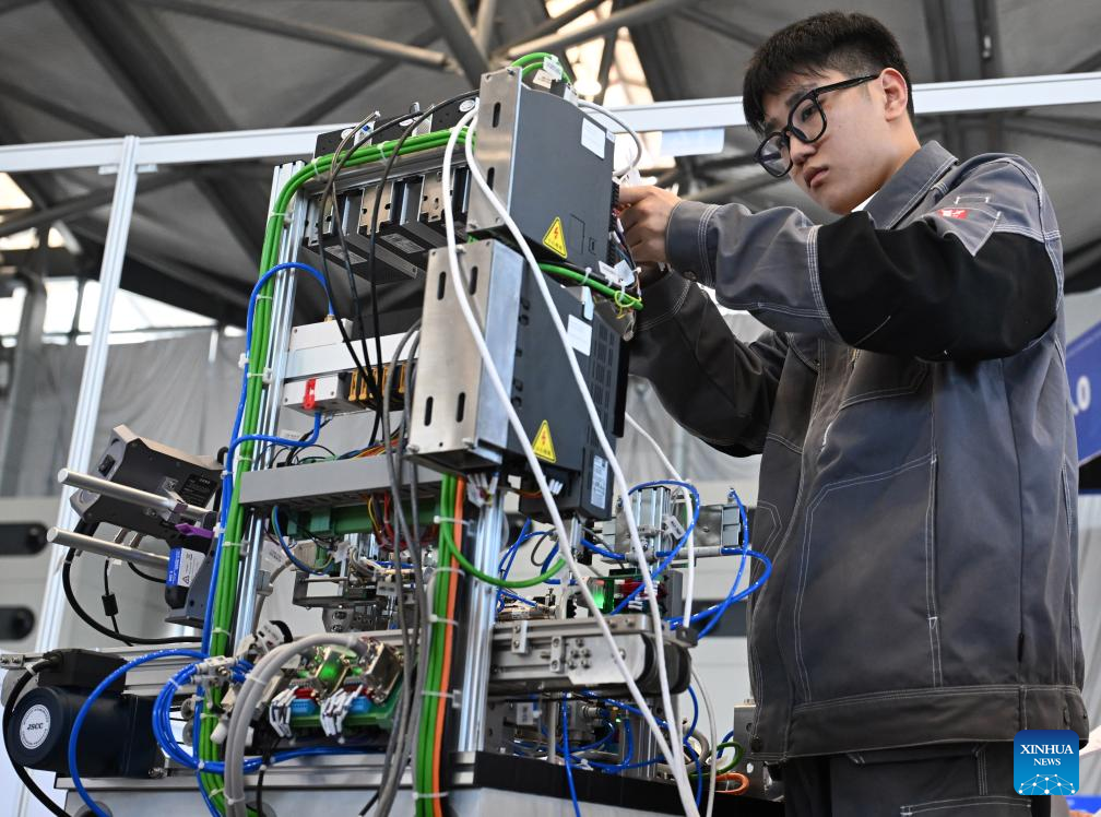 A contestant participates in a robot systems integration event during the third Vocational Skills Competition in Zhengzhou, central China's Henan Province, Sept. 20, 2025. (Xinhua/Hao Yuan)