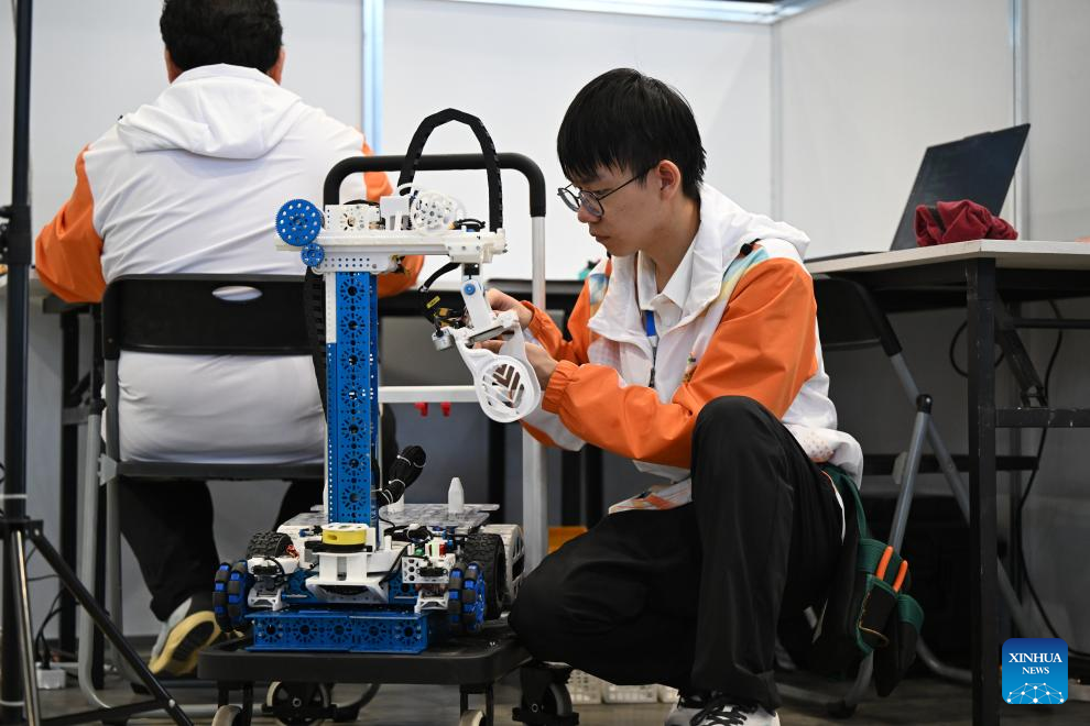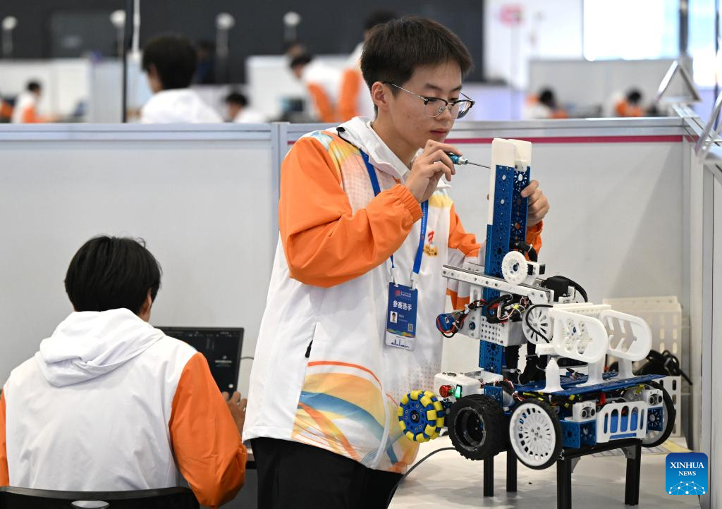 Contestants participate in an autonomous mobile robot event during the third Vocational Skills Competition in Zhengzhou, central China's Henan Province, Sept. 20, 2025. (Xinhua/Li Jianan)