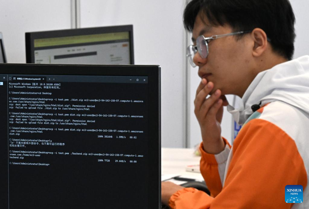 A contestant participates in a cloud computing event during the third Vocational Skills Competition in Zhengzhou, central China's Henan Province, Sept. 21, 2025. (Xinhua/Li Jianan)