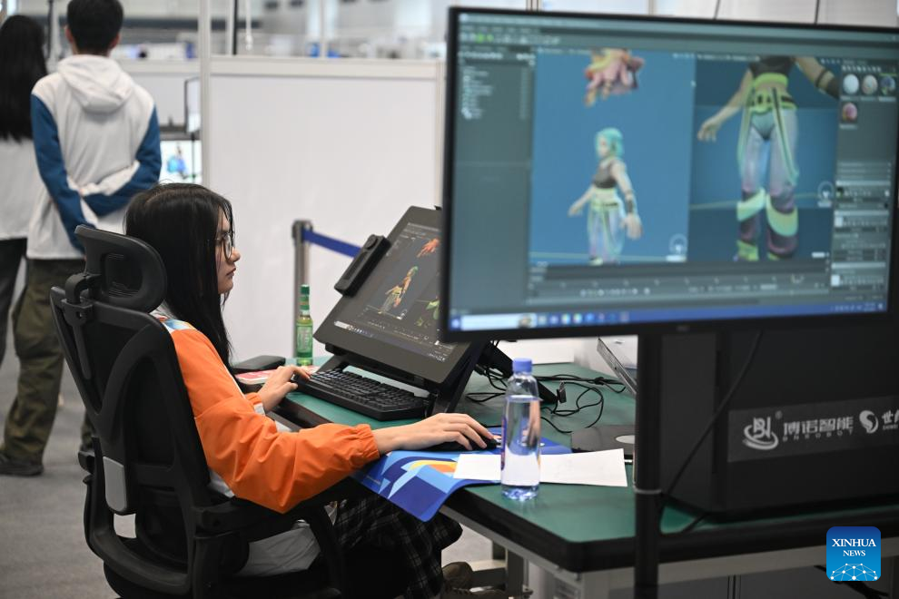 A contestant participates in an art designing for 3D digital gaming event during the third Vocational Skills Competition in Zhengzhou, central China's Henan Province, Sept. 21, 2025. (Xinhua/Li Jianan)