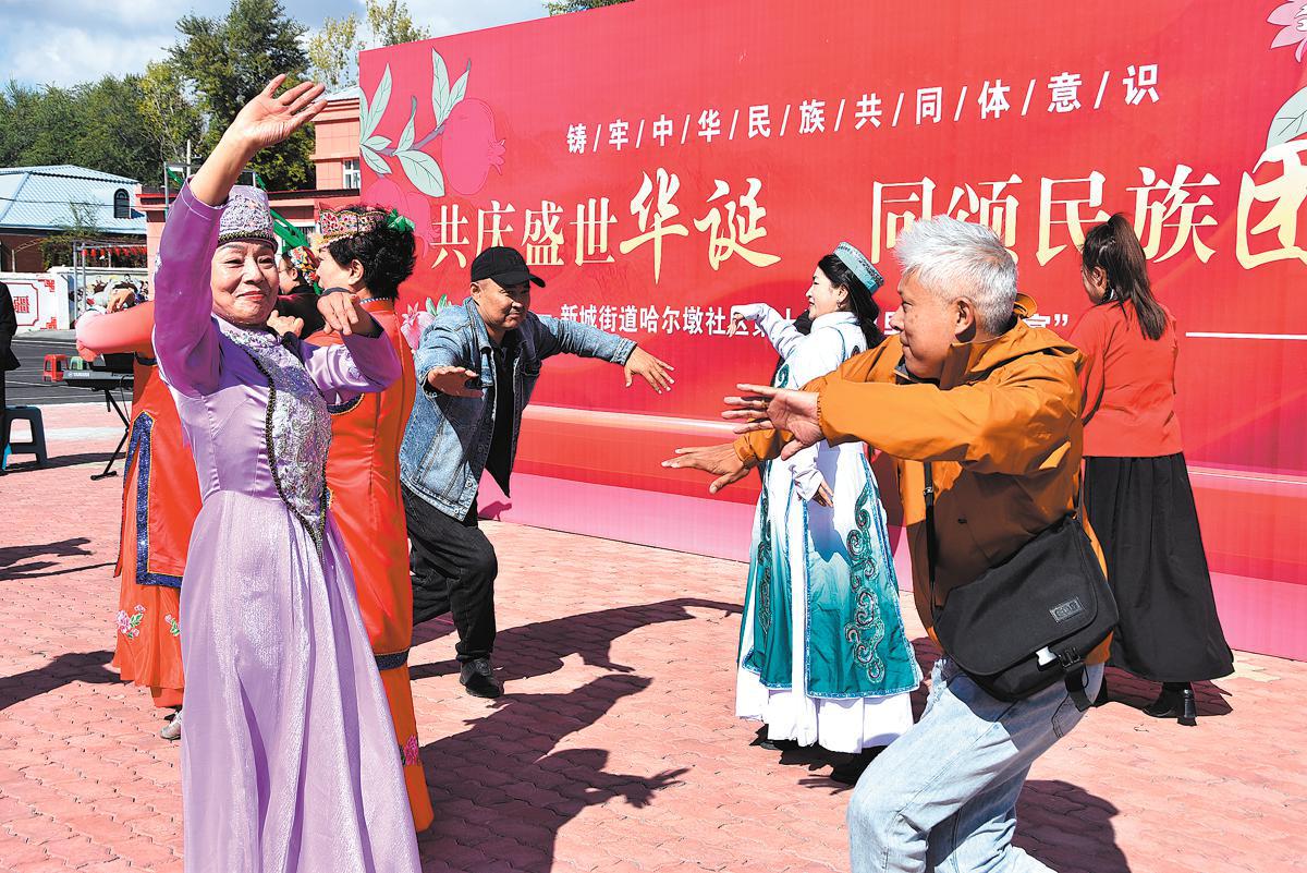Residents dance during a communal banquet in Tacheng, Xinjiang, in September last year. The Hardun community is home to 14 ethnic groups. GU YU/XINHUA